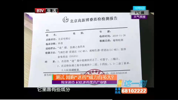 近日,北京电视台以题为《独家调查:起底迷药黑色产业链》曝光了一些买卖迷药的不法行为。记者为采访录制该视频报道,实地采访了北京高新博睿检测中心。并带着从网上购买的两瓶不同款迷药请高新博睿检测中心检测,结果发现,其中有假迷药。这让记者感到十分惊讶。